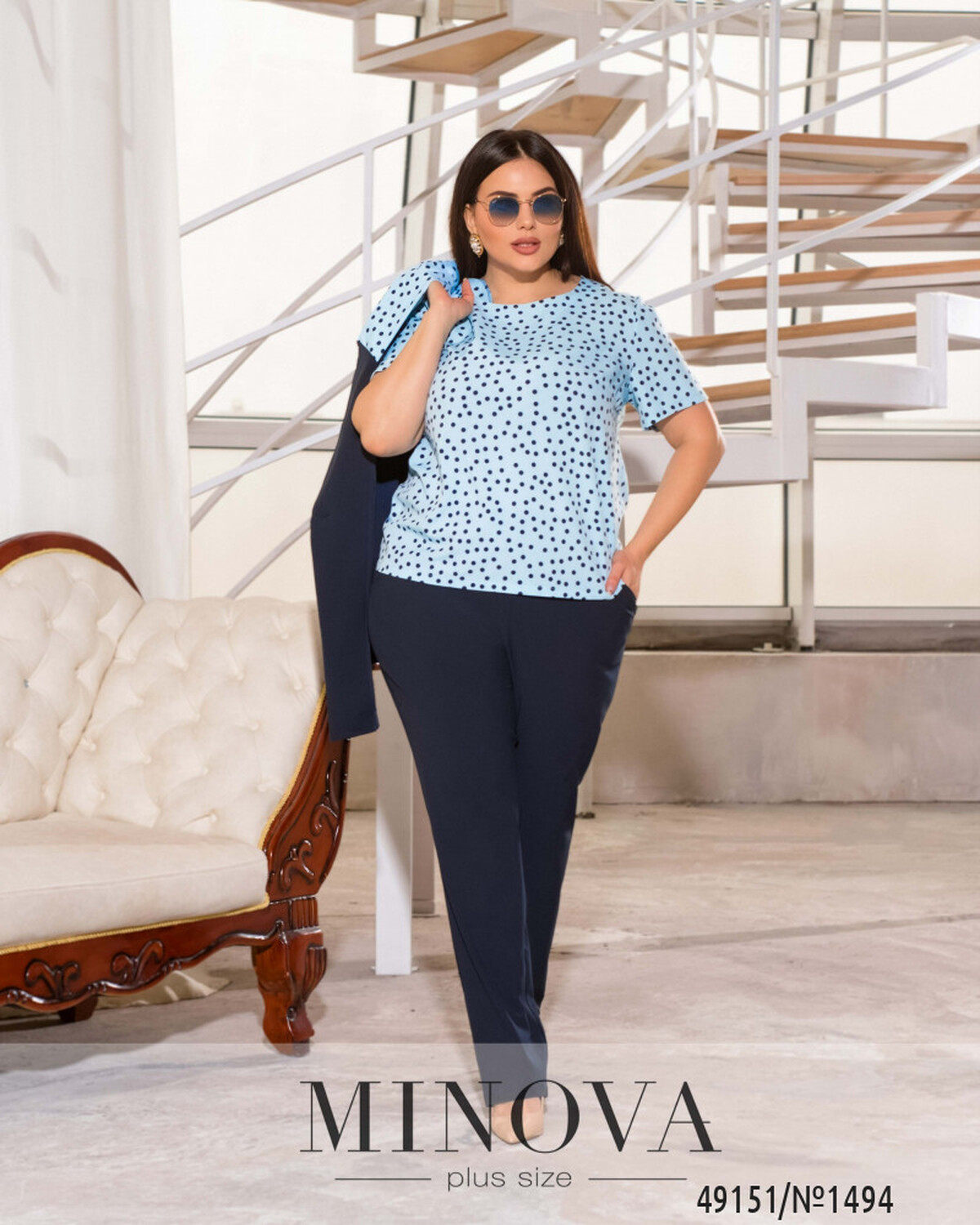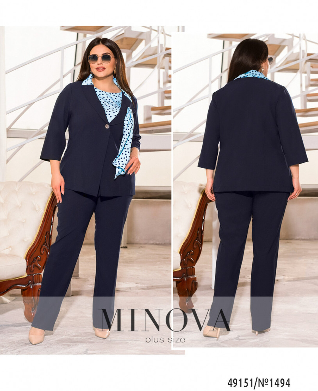 Цей костюм трійка привертає увагу своїм витонченим та стильним дизайном. Він складається з піджака, який виготовлений з еврокостюмки та пришитим до підборту шарфиком з софту, який огинає виріб по шиї та переходить у петельку другого підбортику і додає неповторний шарм цьому образу, а також текстури. Широкий виріз V-форми підкреслює красу відкритої шиї, а широкі рукави довжини 7/8 додають елегантності цьому образу. Крім того, у комплекті є чарівна блуза в горошок з короткими рукавами, яка гармонійно поєднується з шарфиком на піджаку, зверніть увагу, що розмір принту може змінюватись в залежності від партії. А завершенням цього чудового комплекту є класичні брюки в тон піджака з гумкою на талії та бічними кишенями. Цей костюм трійка стане ідеальним вибором для бізнес-зустрічей, офіційних заходів та будь-яких інших важливих подій.