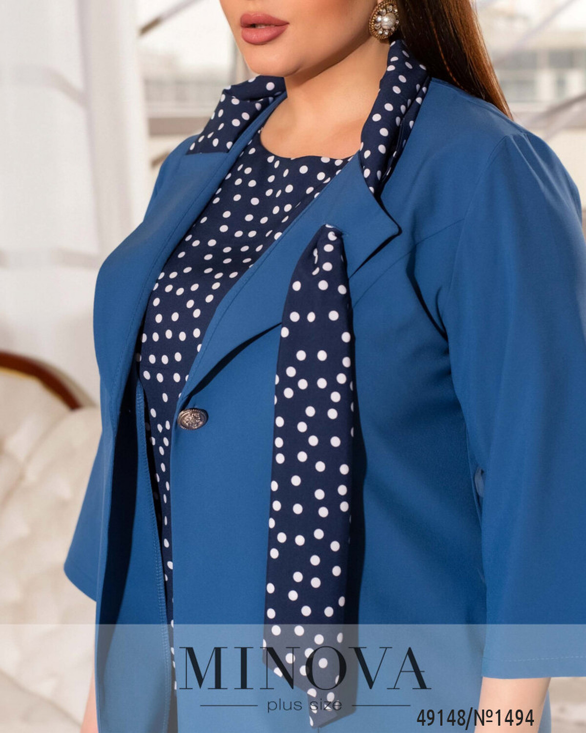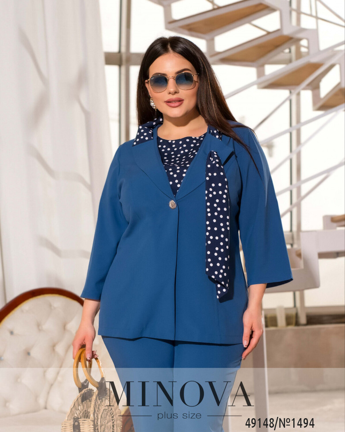 Цей костюм трійка привертає увагу своїм витонченим та стильним дизайном. Він складається з піджака, який виготовлений з еврокостюмки та пришитим до підборту шарфиком з софту, який огинає виріб по шиї та переходить у петельку другого підбортику і додає неповторний шарм цьому образу, а також текстури. Широкий виріз V-форми підкреслює красу відкритої шиї, а широкі рукави довжини 7/8 додають елегантності цьому образу. Крім того, у комплекті є чарівна блуза в горошок з короткими рукавами, яка гармонійно поєднується з шарфиком на піджаку, зверніть увагу, що розмір принту може змінюватись в залежності від партії. А завершенням цього чудового комплекту є класичні брюки в тон піджака з гумкою на талії та бічними кишенями. Цей костюм трійка стане ідеальним вибором для бізнес-зустрічей, офіційних заходів та будь-яких інших важливих подій.