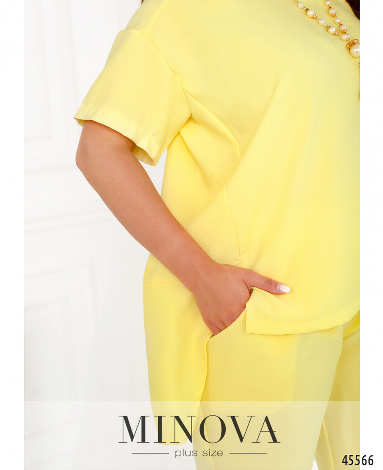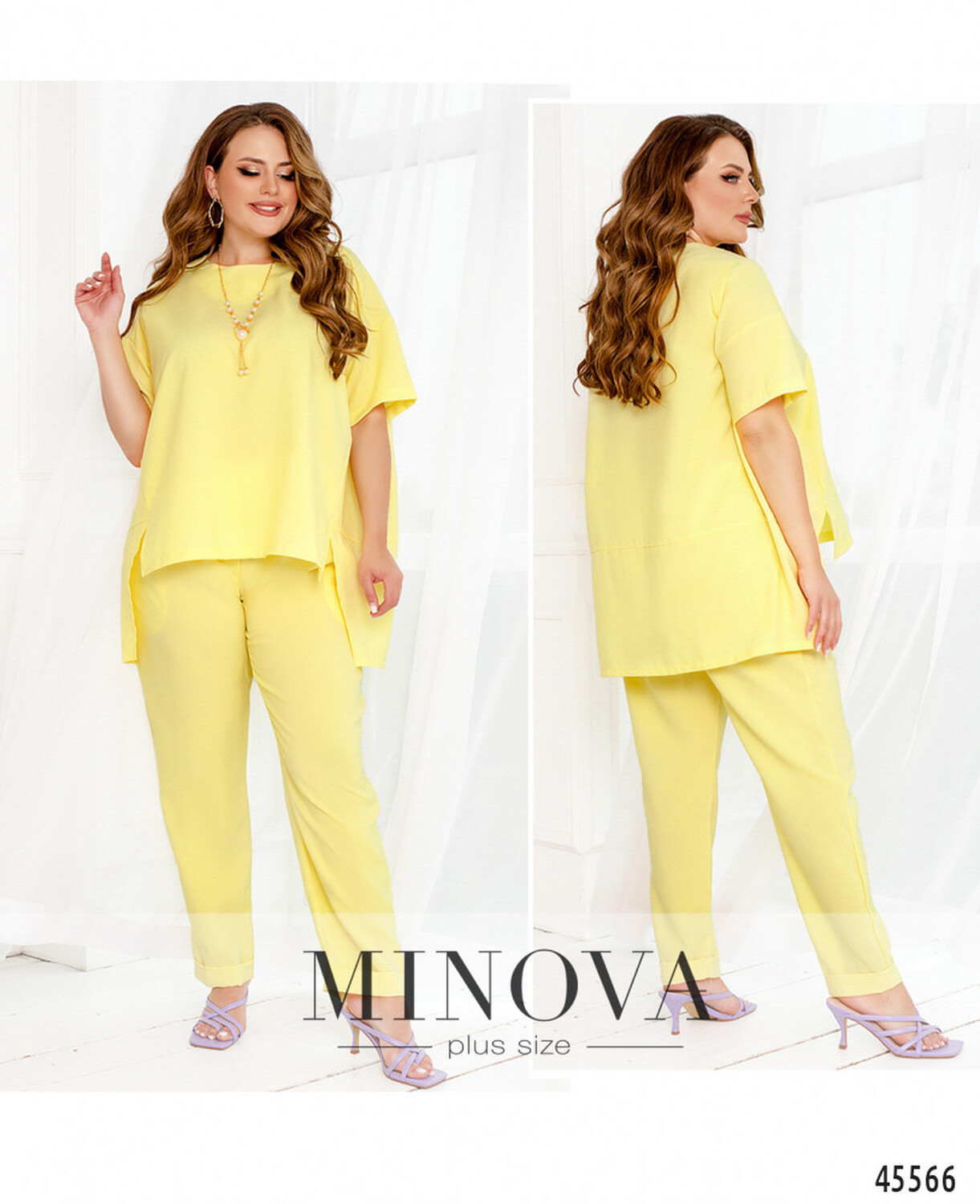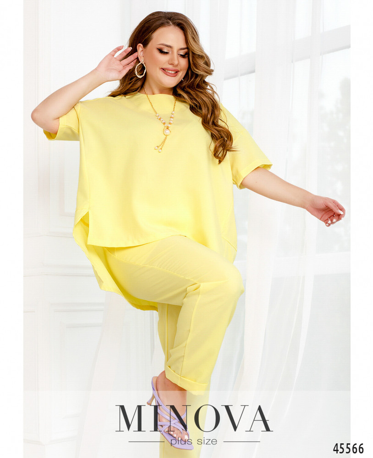 Стильний однотонний костюм, виконаний з легкої тонкої тканини – універсальне літнє рішення для будь-якої модниці. Він складається з лаконічних штанів на резинці і блузи актуальної форми oversize. Штани на резинці звуженої форми з манжетами доповнені декоративною ширинкою (імітацією), защипами спереду і кишенями з боків. Блуза вільного крою звертає на себе увагу завдяки приспущеній лінії плечей і асиметричному подолу з розрізами.