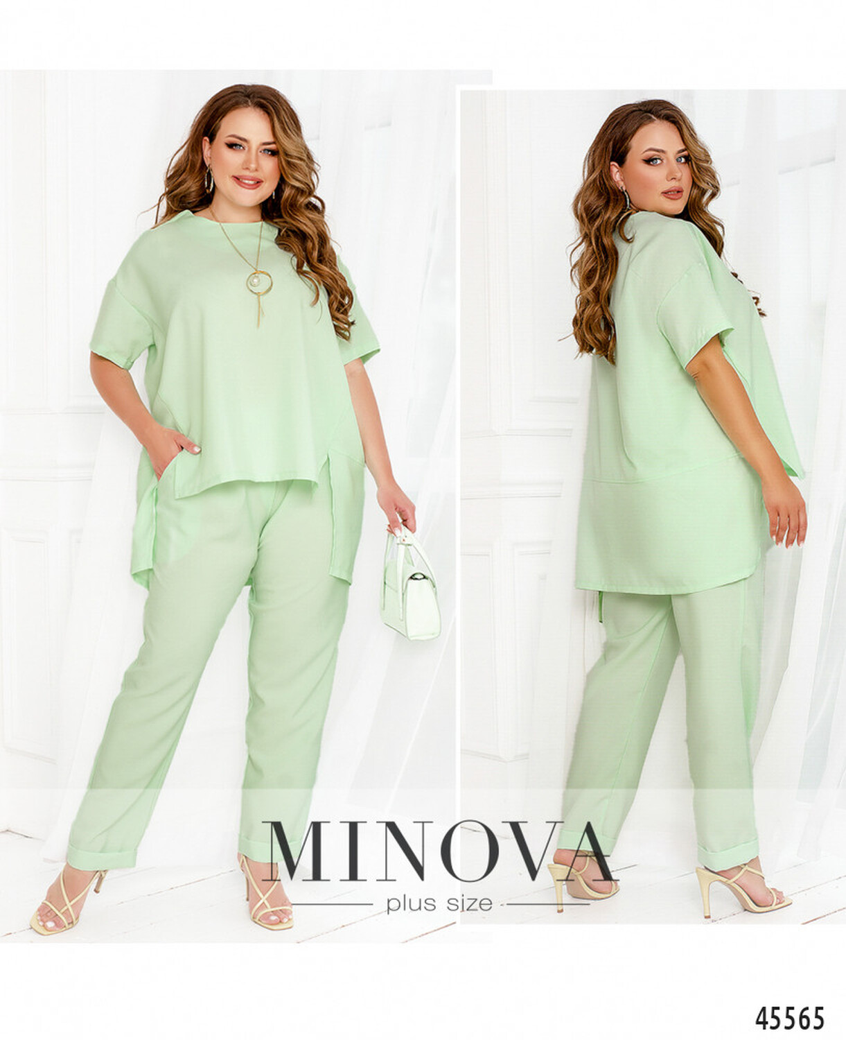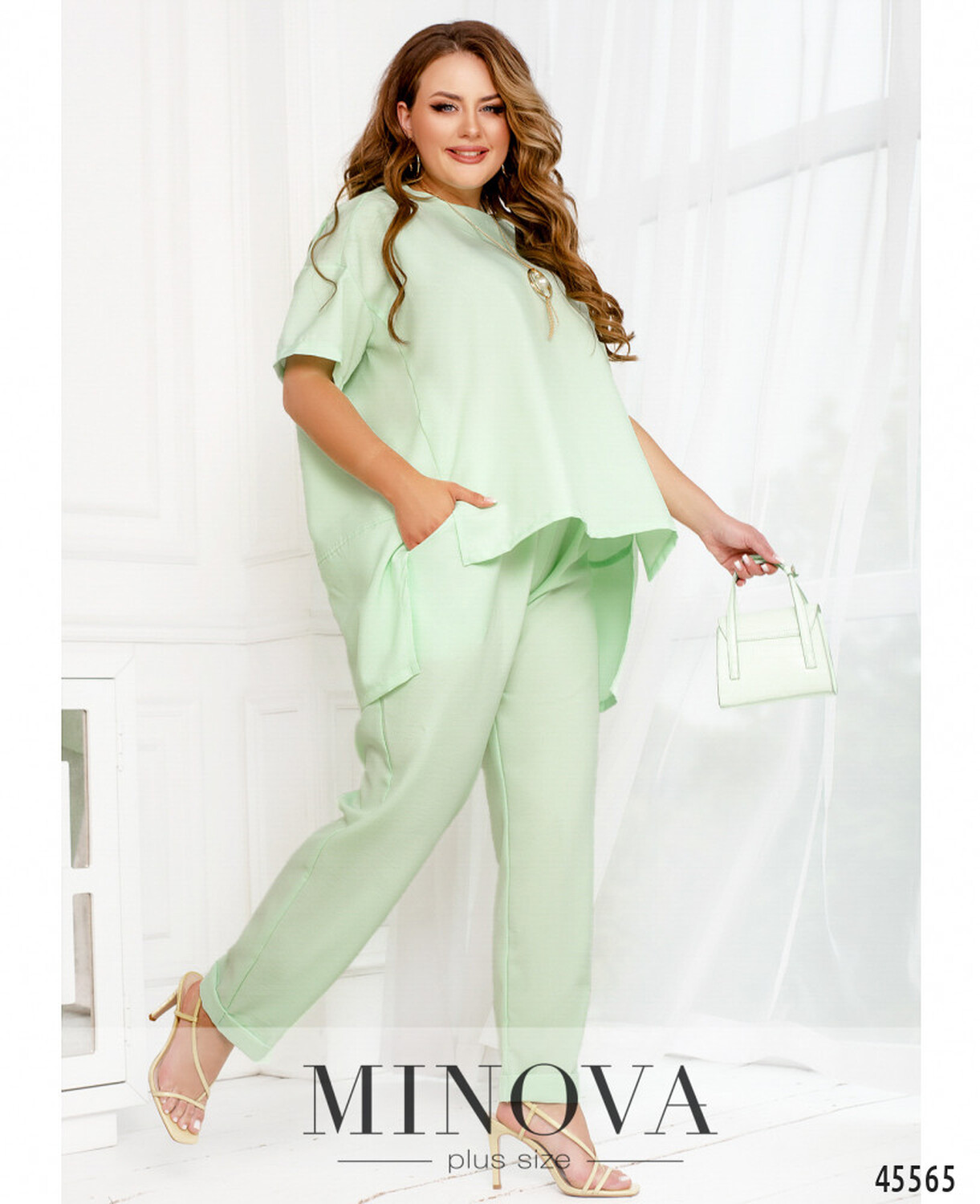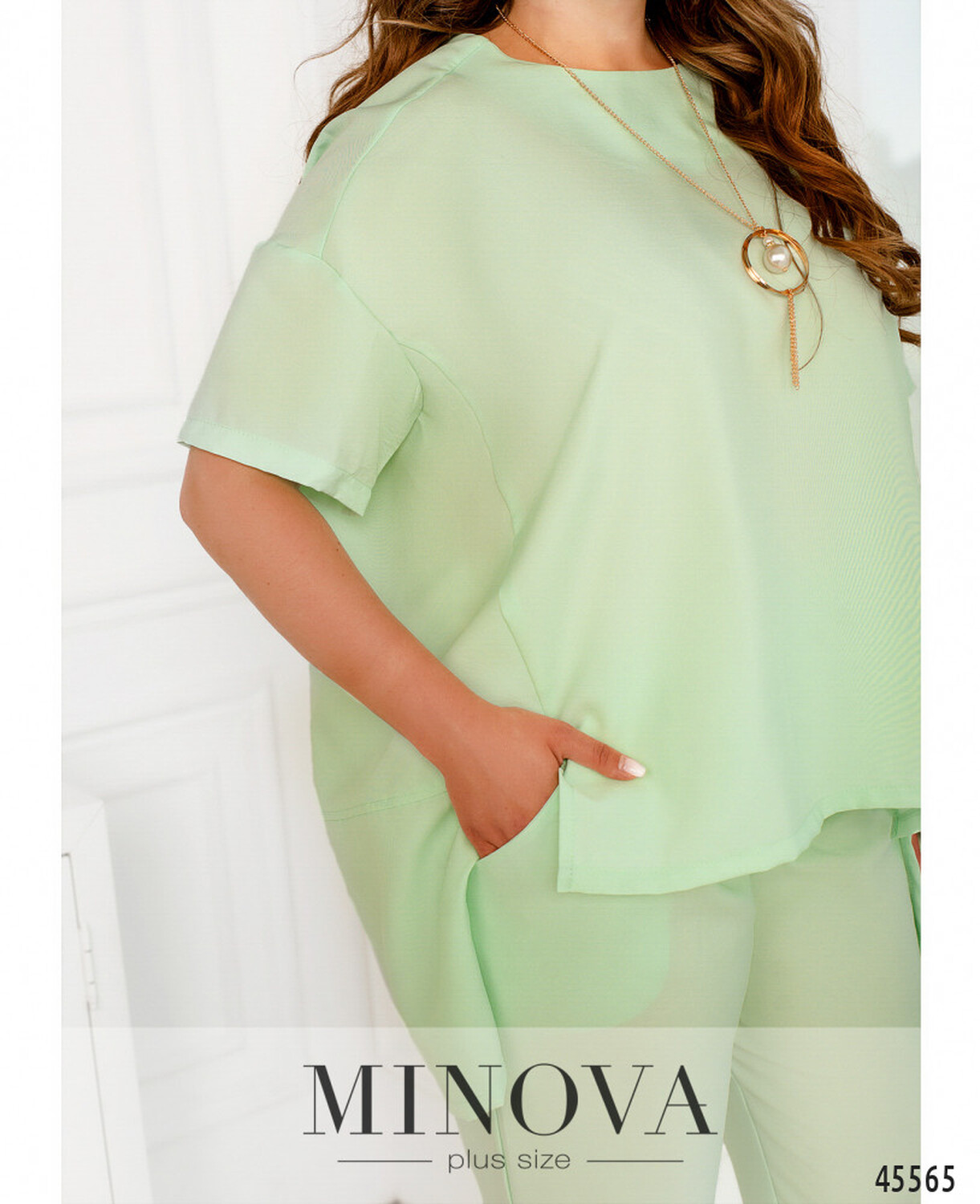 Стильний однотонний костюм, виконаний з легкої тонкої тканини – універсальне літнє рішення для будь-якої модниці. Він складається з лаконічних штанів на резинці і блузи актуальної форми oversize. Штани на резинці звуженої форми з манжетами доповнені декоративною ширинкою (імітацією), защипами спереду і кишенями з боків. Блуза вільного крою звертає на себе увагу завдяки приспущеній лінії плечей і асиметричному подолу з розрізами.