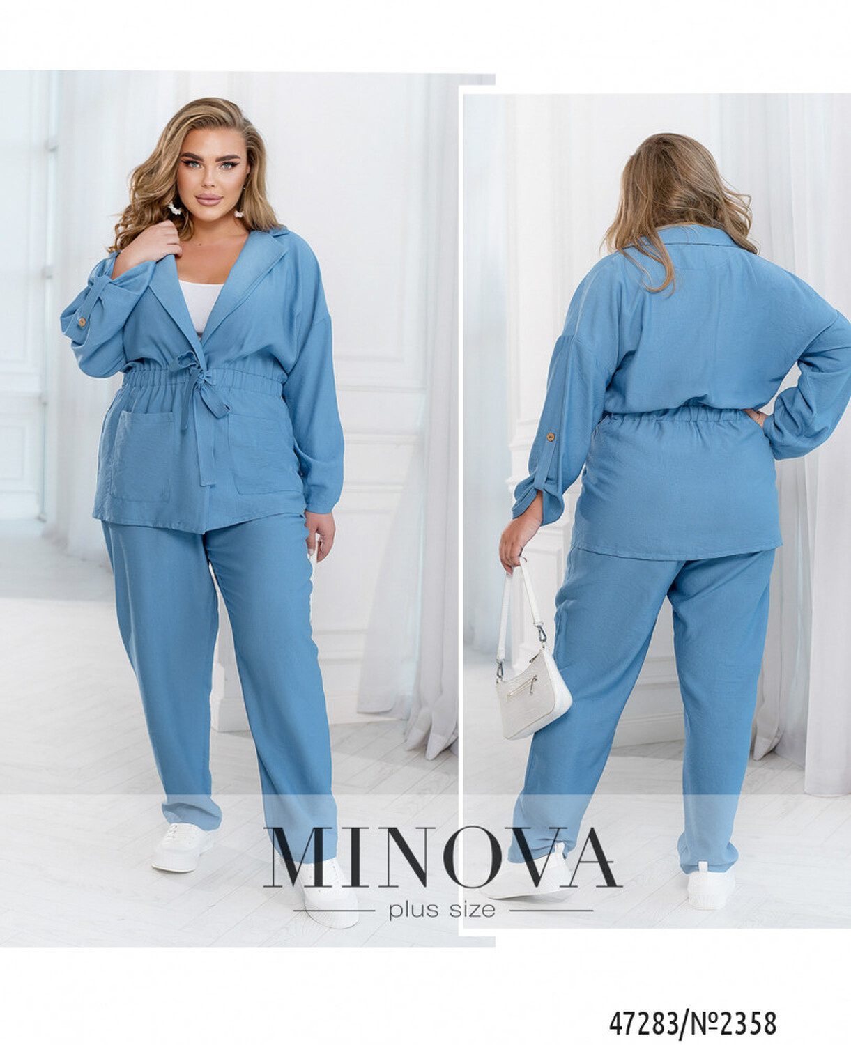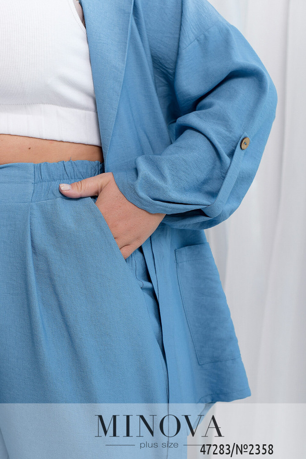 Стильний монохромний костюм – ідеальний варіант для теплої весни та спекотного літа. У комплект входять лаконічні штани на резинці з кишенями та блуза на зав'язках та резинці, вшитій по лінії таліі, виконана в формі жакета з коміром. Костюм може бути ідеально доповнений як класичними туфлями, так і лоферами чи кросівками.