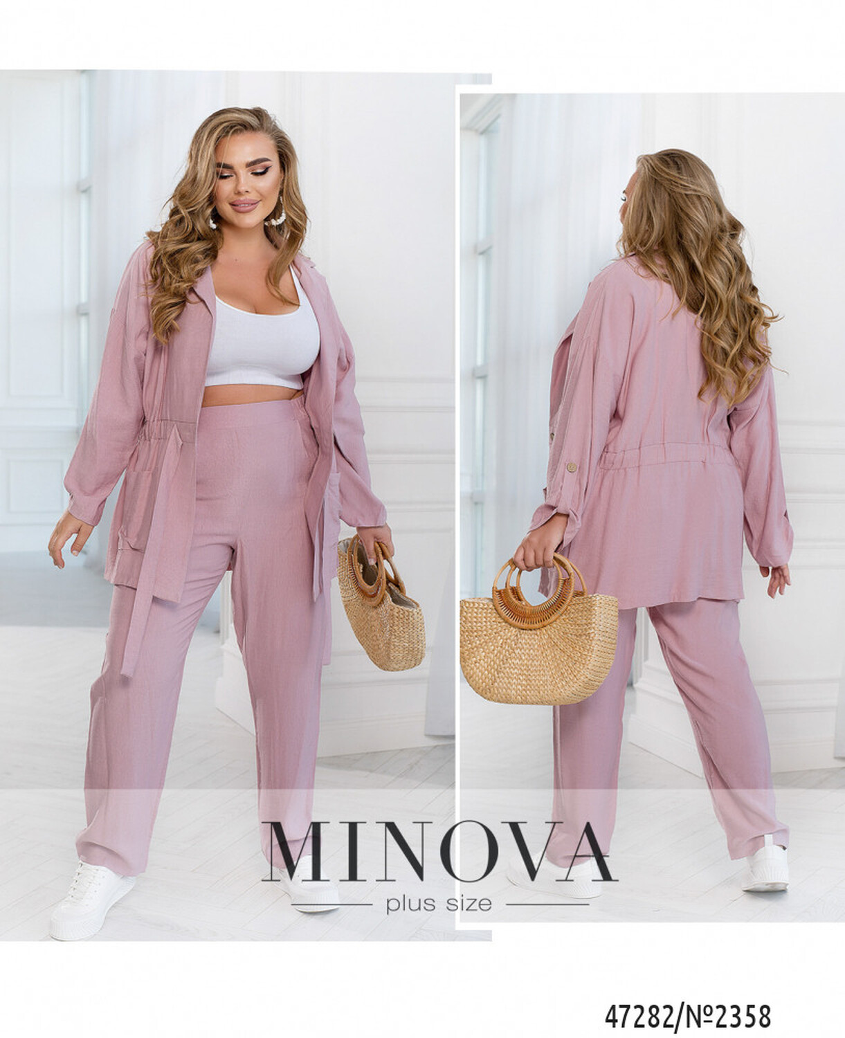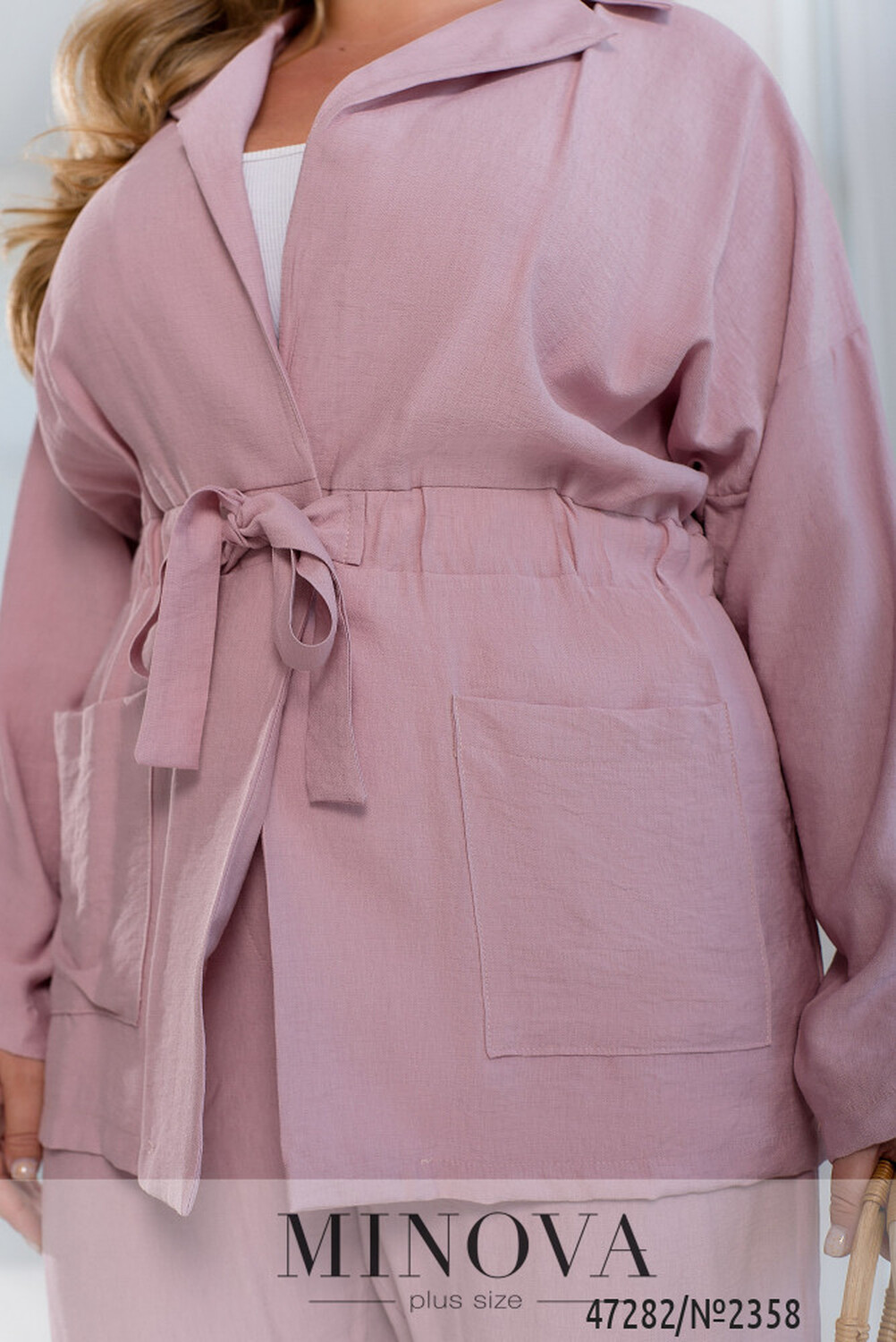 Стильний монохромний костюм – ідеальний варіант для теплої весни та спекотного літа. У комплект входять лаконічні штани на резинці з кишенями та блуза на зав'язках та резинці, вшитій по лінії таліі, виконана в формі жакета з коміром. Костюм може бути ідеально доповнений як класичними туфлями, так і лоферами чи кросівками.