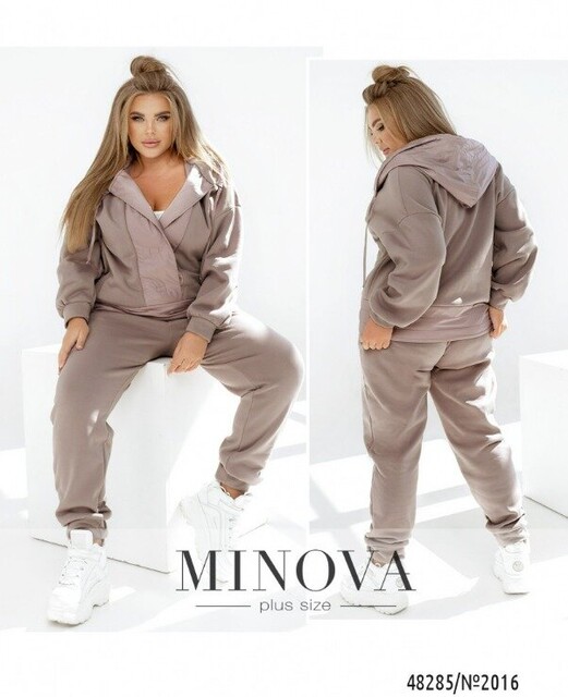 Стильний костюм, який підкреслить вашу індивідуальність та стиль. Костюм складається з кофти оверсайз крою з опущеною лінією плечей та високим манжетом на рукавах. По передній частині вертикальна вставка із плащівки, яка переходить в широкий капюшон та горизонтальну вставку по нижній частині виробу. Така кофта огорне теплом навіть в холодну та вітряну погоду та подарує відчуття комфорту. Штани з широким поясом, манжетами та бічними кишенями. Такий костюм можна стилізувати як в більш кежуал образах, комбінувавши його з пальто чи курткою в більш класичному стилі, так і в спортивних образах з об'ємною курткою.