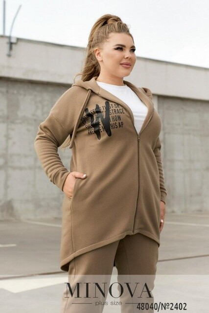 Костюм, який точно вартує вашої уваги. Яскраві кольори та зручний крій - головні елементи для вашого комфорту. Подовжена кофта зі спущеним плечовим швом на блискавці в тон костюму. Рукава на манжетах. Виріб також доповнено капюшоном зі шнурівкою. Права частина декорована термоналіпкою. Поділ кофти подовжено по спинці та заокруглено.