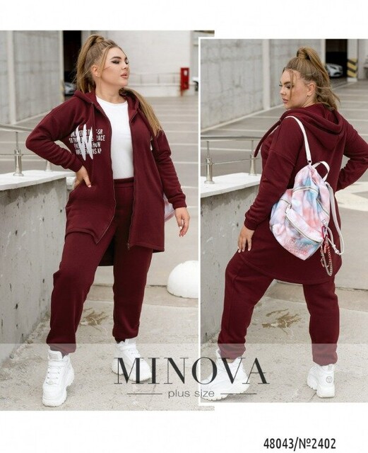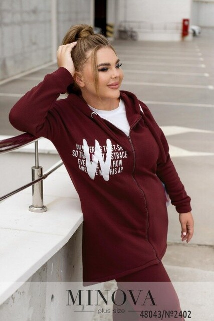 Костюм, який точно вартує вашої уваги. Яскраві кольори та зручний крій - головні елементи для вашого комфорту. Подовжена кофта зі спущеним плечовим швом на блискавці в тон костюму. Рукава на манжетах. Виріб також доповнено капюшоном зі шнурівкою. Права частина декорована термоналіпкою. Поділ кофти подовжено по спинці та заокруглено.