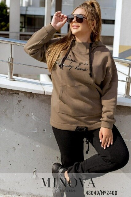 В комплекті також зручне худі з приспущеним плечовим швом, яке доповнено об'ємною кишенею-кенгуру по передній частині. По низу худі люверси та шнурок, який можна затягнути при необхідності. Рукави на манжетах, а на грудях ми додали термоналіпку, як яскравий елемент для привернення уваги. Виріб також має капюшон зі шнурком і люверсами.