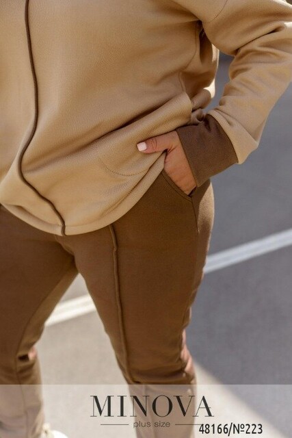 Сучасний костюм двійка в спортивному стилі, який складається з кофти з капюшоном, яка доповнена боковими кишенями та приспущеним рукавами на манжеті та штани з гумкою на талії та пропущеним шнурком. Штани з нашитою "стрілкою" спереду по центру. До манжетів внизу вшито гумку з боків - кишені у шві. Універсальний костюм, який підходить як для прогулянок, так і занять спортом.
