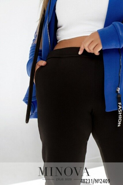 Такий спортивний костюм однозначно увійде в топ ваших улюблених. Кофта оригінального крою з діагональною блискавкою та асиметричним низом. До кофти ми додали капюшон, через який протягнуто об'ємний шнурок та додані люверси. Рукава доповненні широким манжетом, а на одній стороні є функціональна накладна кишеня. Стилізуйте таку річ поверх гольфів без горловини чи поверх топів, як на нашій моделі. Штани-джогери з гумкою на талії, манжетами та бічними кишенями.