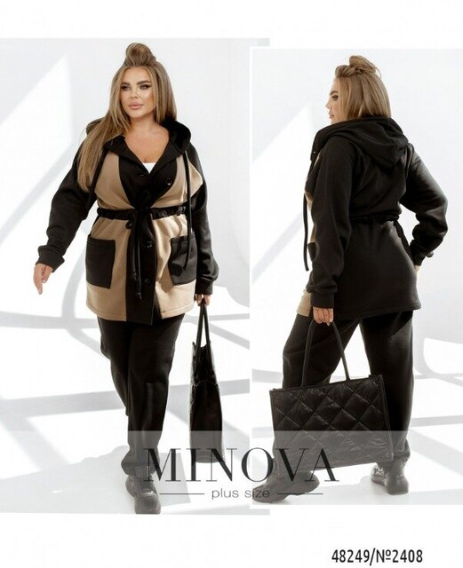 Яскравий костюм, який приверне увагу до себе завдяки оригінальному крою. В комплекті подовжена контрастна кофтинка, яка застібається на ряд ґудзиків. Талію ми доповнили функціональною куліскою, тому ви зможете зробити свій силует більш витонченим. Також ми додали капюшон з об'ємними шнурками, який буде захищати вас в непогоду. Рукава спущеного крою з манжетами. На основній частині ми додали накладні кишені. Штани прямого крою з гумкою на талії та бічними кишенями.