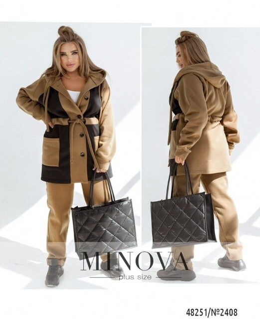Яскравий костюм, який приверне увагу до себе завдяки оригінальному крою. В комплекті подовжена контрастна кофтинка, яка застібається на ряд ґудзиків. Талію ми доповнили функціональною куліскою, тому ви зможете зробити свій силует більш витонченим. Також ми додали капюшон з об'ємними шнурками, який буде захищати вас в непогоду. Рукава спущеного крою з манжетами. На основній частині ми додали накладні кишені. Штани прямого крою з гумкою на талії та бічними кишенями.