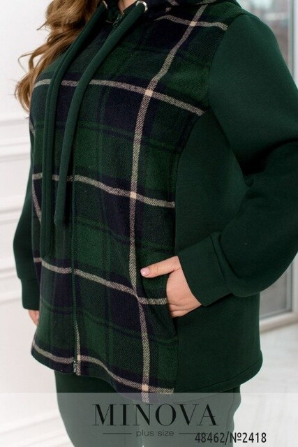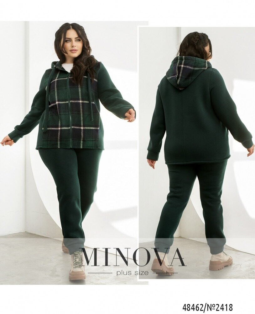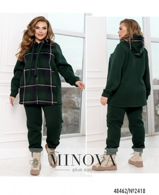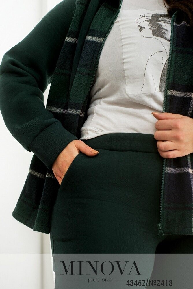 Повсякденний костюм у спортивному стилі, який виготовлений з трьохнитки на флісі, преміальної якості, яка не кошлатиться. Кофта складається з комбінації принтованої тканини в клітинку, а також однотонної основи. Кофта доповнена капюшоном зі шнурком та люверсами, а також бічними кишенями. Рукава довгі з манжетами. Штани з гумкою на талії та бічними кишенями. Внизу штани на манжетах. В такому костюмі Вам однозначно буде тепло та затишно.