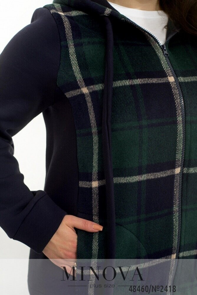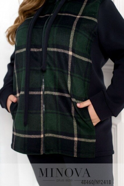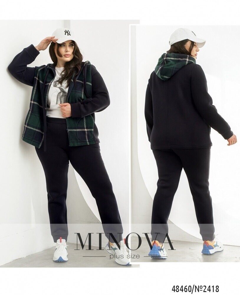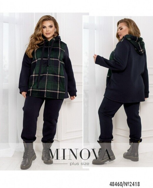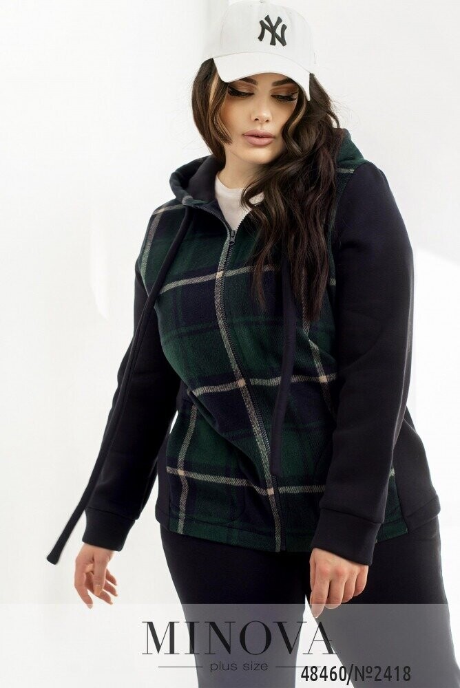 Повсякденний костюм у спортивному стилі, який виготовлений з трьохнитки на флісі, преміальної якості, яка не кошлатиться. Кофта складається з комбінації принтованої тканини в клітинку, а також однотонної основи. Кофта доповнена капюшоном зі шнурком та люверсами, а також бічними кишенями. Рукава довгі з манжетами. Штани з гумкою на талії та бічними кишенями. Внизу штани на манжетах. В такому костюмі Вам однозначно буде тепло та затишно.