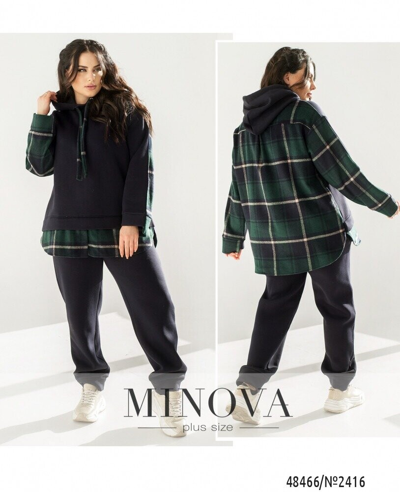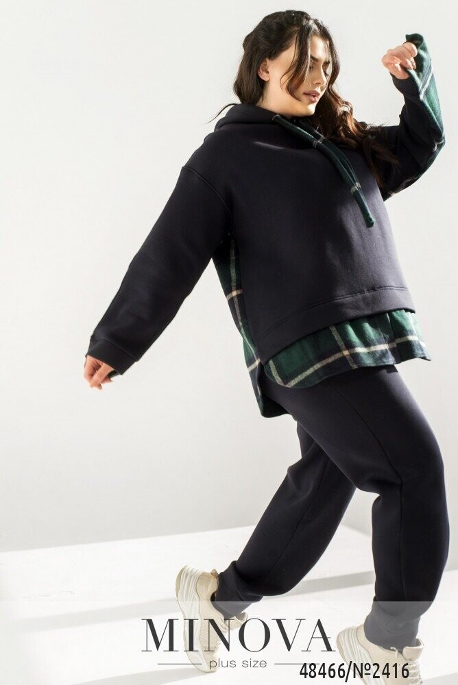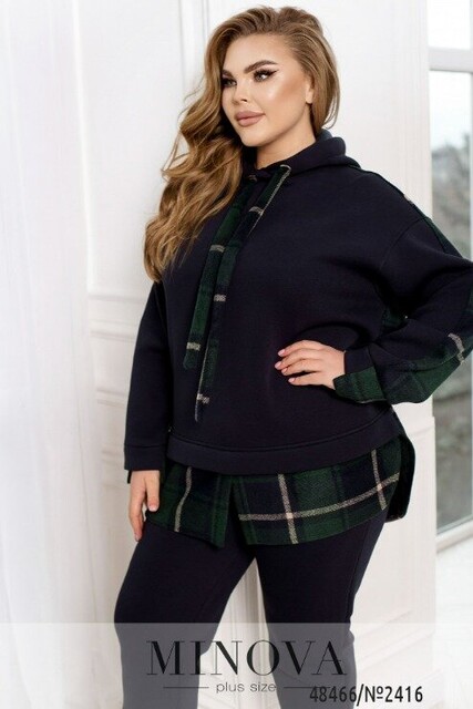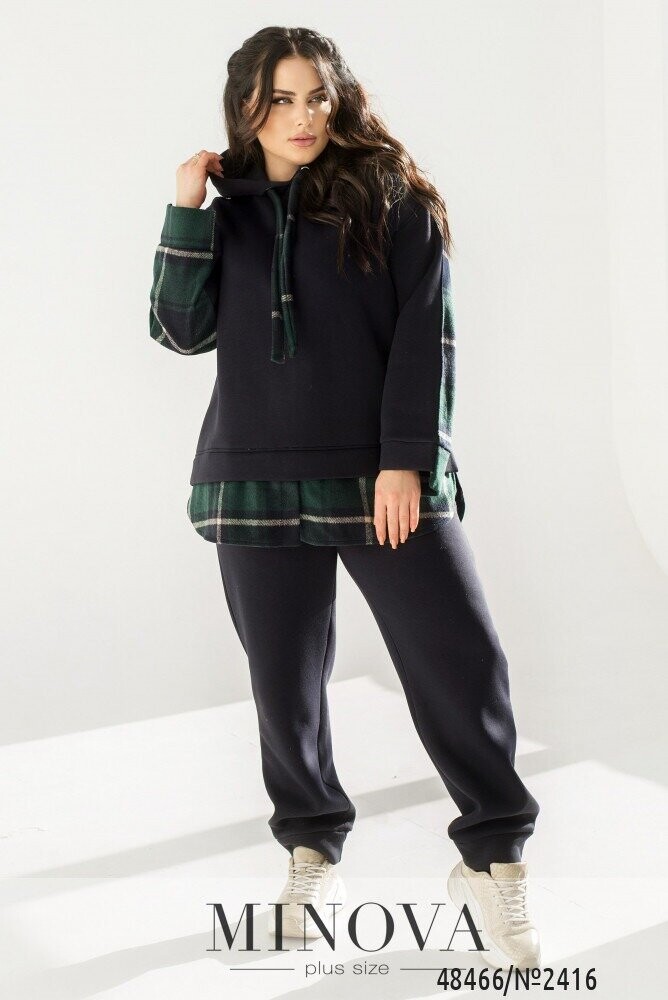 Чудовий варіант костюма для тих, кому хочеться замінити однотонні спортивні костюми на щось цікаве. Кофта виконана в комбінації з 2-х варіацій трьохнитки на флісі преміум якості: Основна однотонна основа, оздоблювальна трендова клітинка. Худі оверсайз крою з капюшоном та шнурками з люверсами. По низу виробу, а також по спинці — імітація рубашки. Рукав довгий на манжеті, що складається з двох частин. Внизу бічних швів є розпірки з заокругленими кутами. Перед кофти, лицьова частина рукава та капюшон з основної тканини. Спинка, задня частина рукава та вставка переду з оздоблювальної. Штани прямого крою на манжетах, а верх на еластичній гумці. По боках врізні кишені.