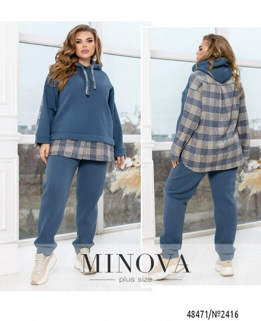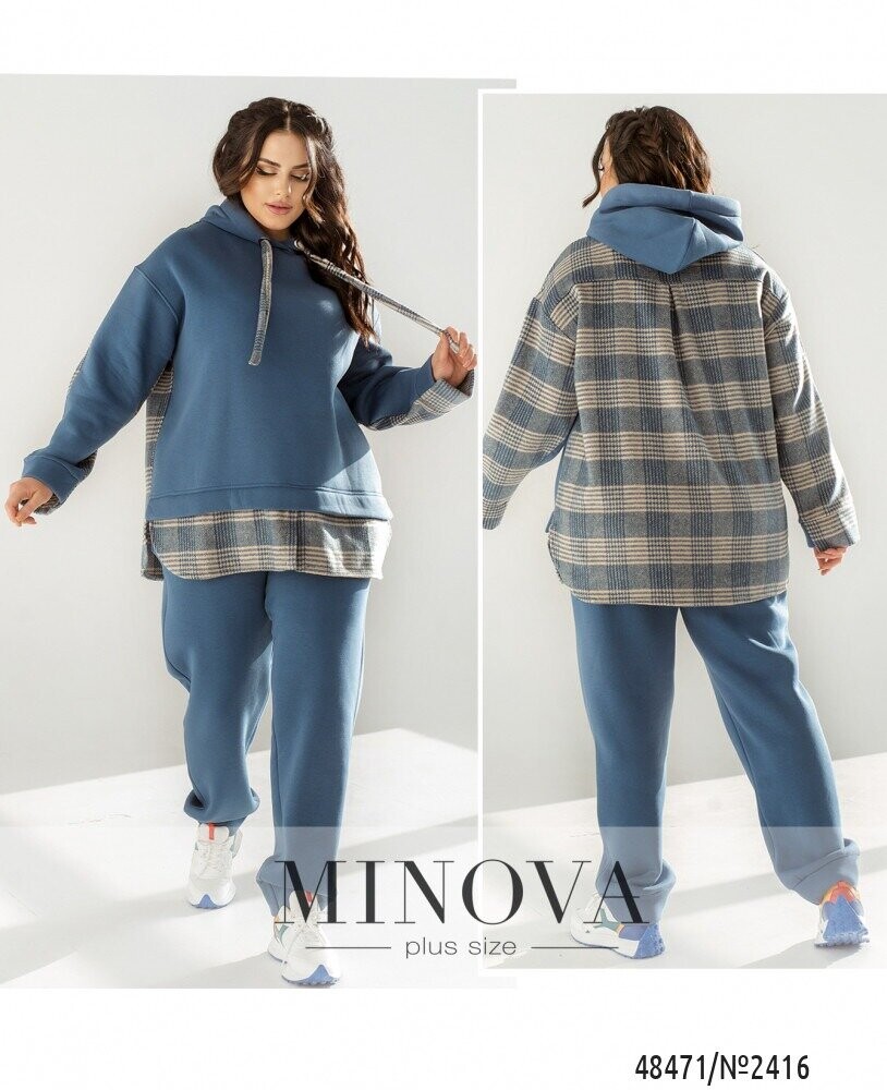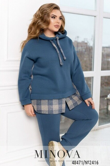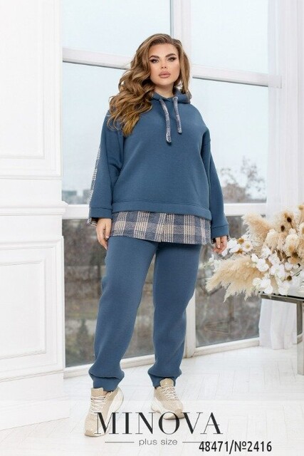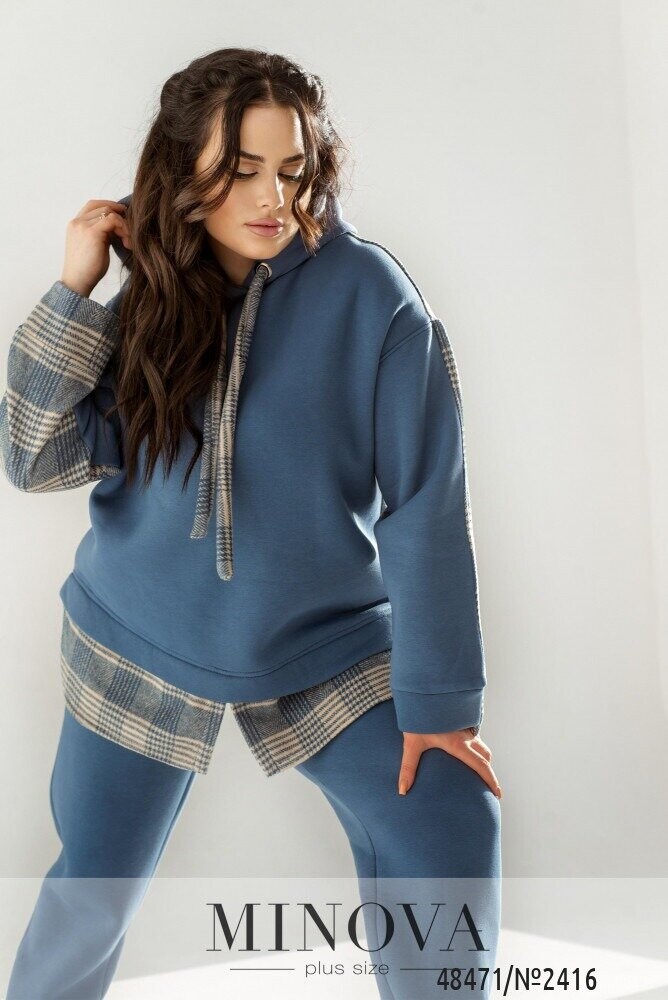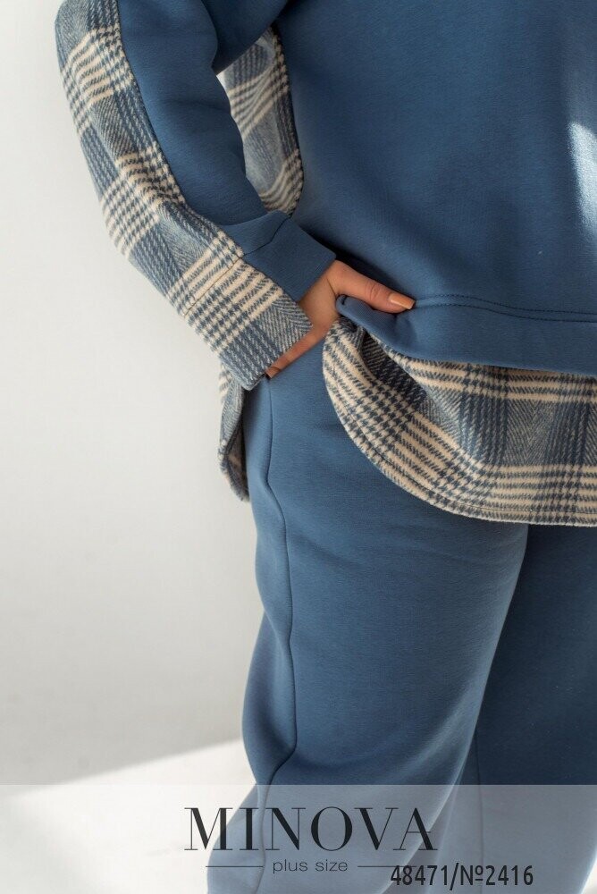 Чудовий варіант костюма для тих, кому хочеться замінити однотонні спортивні костюми на щось цікаве. Кофта виконана в комбінації з 2-х варіацій трьохнитки на флісі преміум якості: Основна однотонна основа, оздоблювальна трендова клітинка. Худі оверсайз крою з капюшоном та шнурками з люверсами. По низу виробу, а також по спинці — імітація рубашки. Рукав довгий на манжеті, що складається з двох частин. Внизу бічних швів є розпірки з заокругленими кутами. Перед кофти, лицьова частина рукава та капюшон з основної тканини. Спинка, задня частина рукава та вставка переду з оздоблювальної. Штани прямого крою на манжетах, а верх на еластичній гумці. По боках врізні кишені.