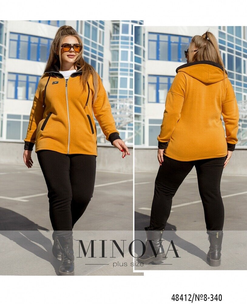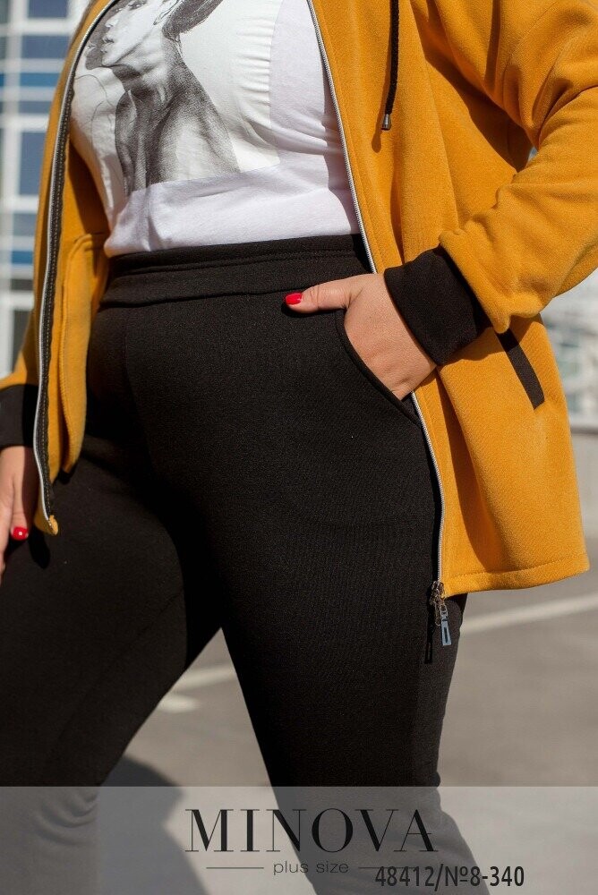 Стильний костюм стане універсальним виробом у вашому гардеробі. Родзинкою моделі є оригінальна кофта на блискавці з високою горловиною та пришитим капюшоном зі шнурком та люверсами, тому ви точно зможете зігрітись цієї осені. Кофта подовжена по спинці, доповнена врізними кишенями з контрастною окантовкою. Рукава спущеного крою доповнені манжетом. Штани з гумкою на талії та манжетом доповнені бічними кишенями.