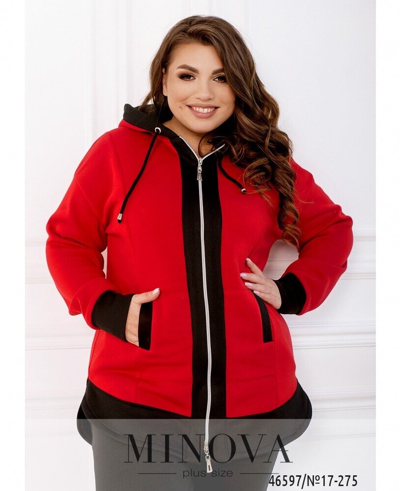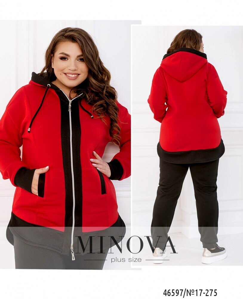 Контрастний спортивний костюм - це універсальний і зручний комплект, який може зігріти в прохолодний день і допоможе створити актуальний осінній образ. Лаконічні однотонні штани на резинці з кишенями і манжетами ідеально доповнює яскрава подовжена кофта з капюшоном, кишенями, змійкою спереду і закругленими кутами з боків.