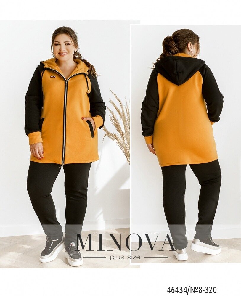 Комфортний спортивний костюм великого розміру порадує прихильниць практичного одягу на кожен день. У комплект входить м'яка кофта на блискавці, доповнена капюшоном кишенями і рукавами "реглан", а також штани з вшитою в пояс резинкою і кишенями в бічних швах.
