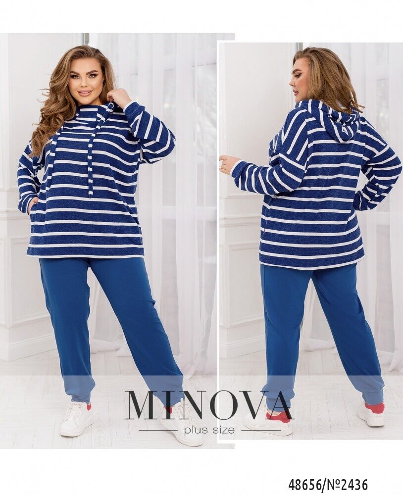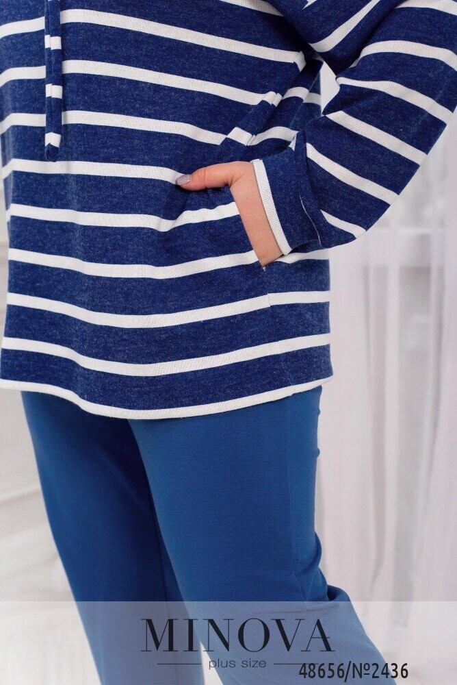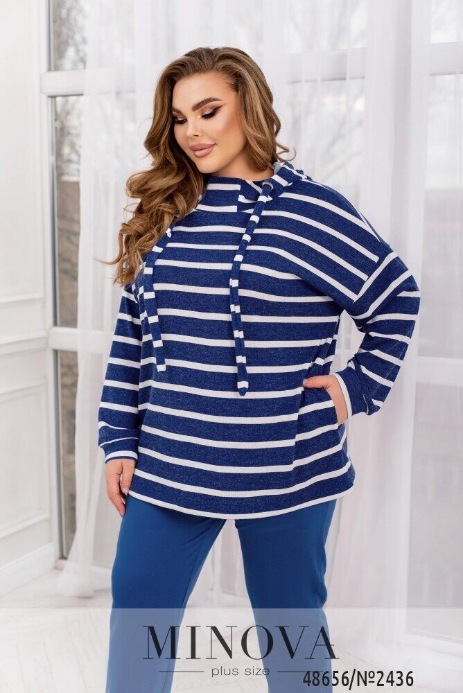 Комфортний костюм двійка, який складається з подовженої кофти оверсайз крою зі стильним принтом в полоску. Модель доповнена капюшоном зі шнурком та люверсами й бічними кишенями. В комплект входять також штани спортивного крою з гумкою на талії та бічними кишенями. Низ оздоблено манжетом.
