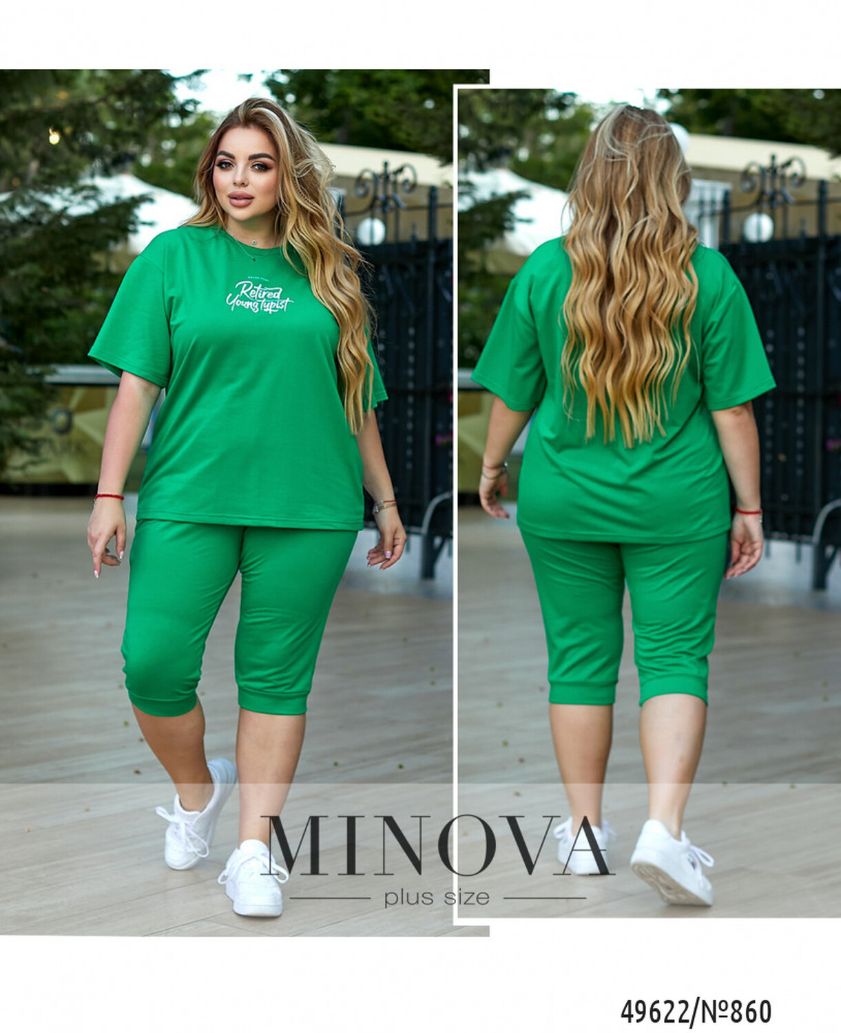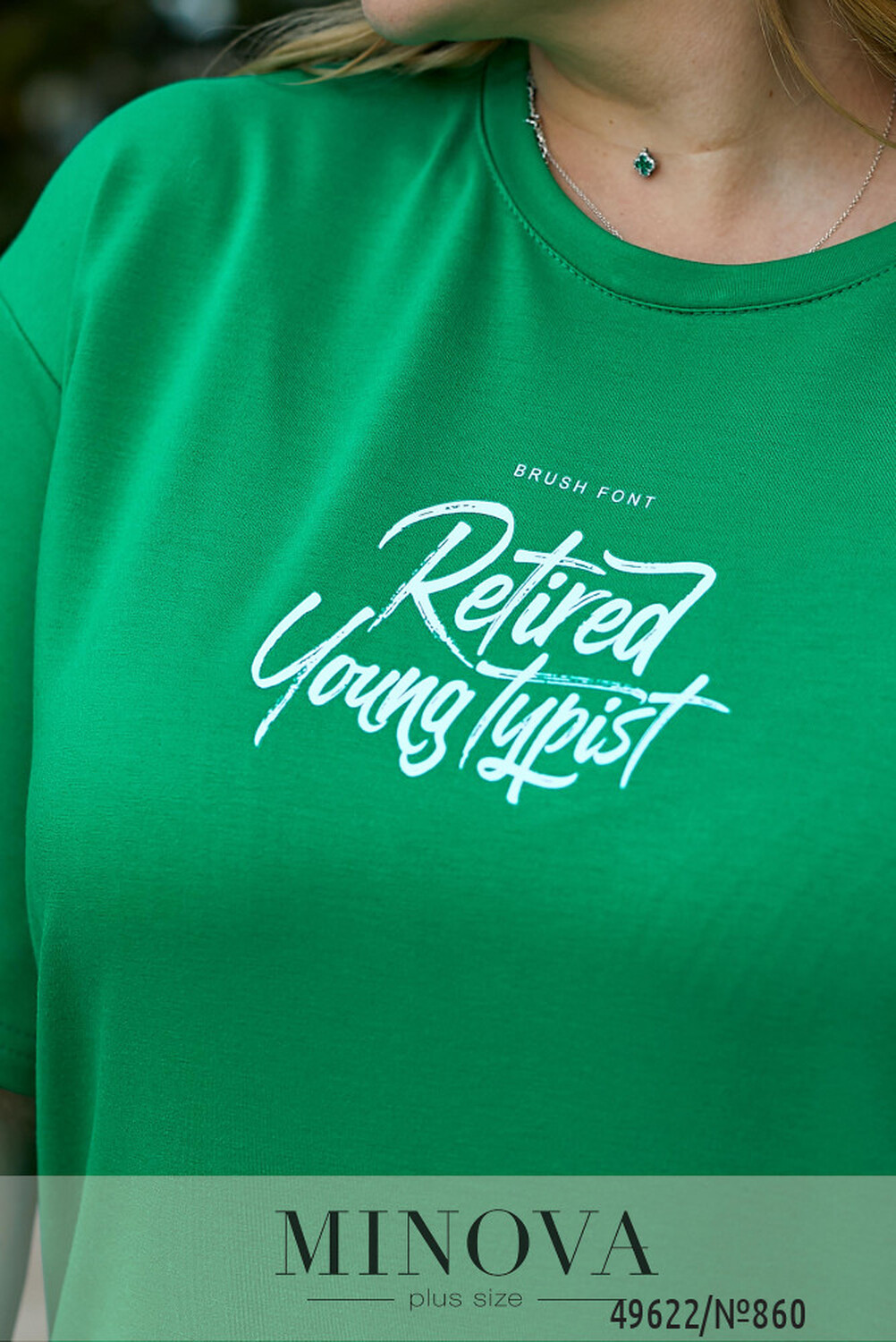 Комплект включає оверсайз футболку зі спущеною лінією плечей. Горловина футболки має напівкруглий крій з окантовкою. На передній частині футболки розташований декоративний напис, що додає особливості стилю.