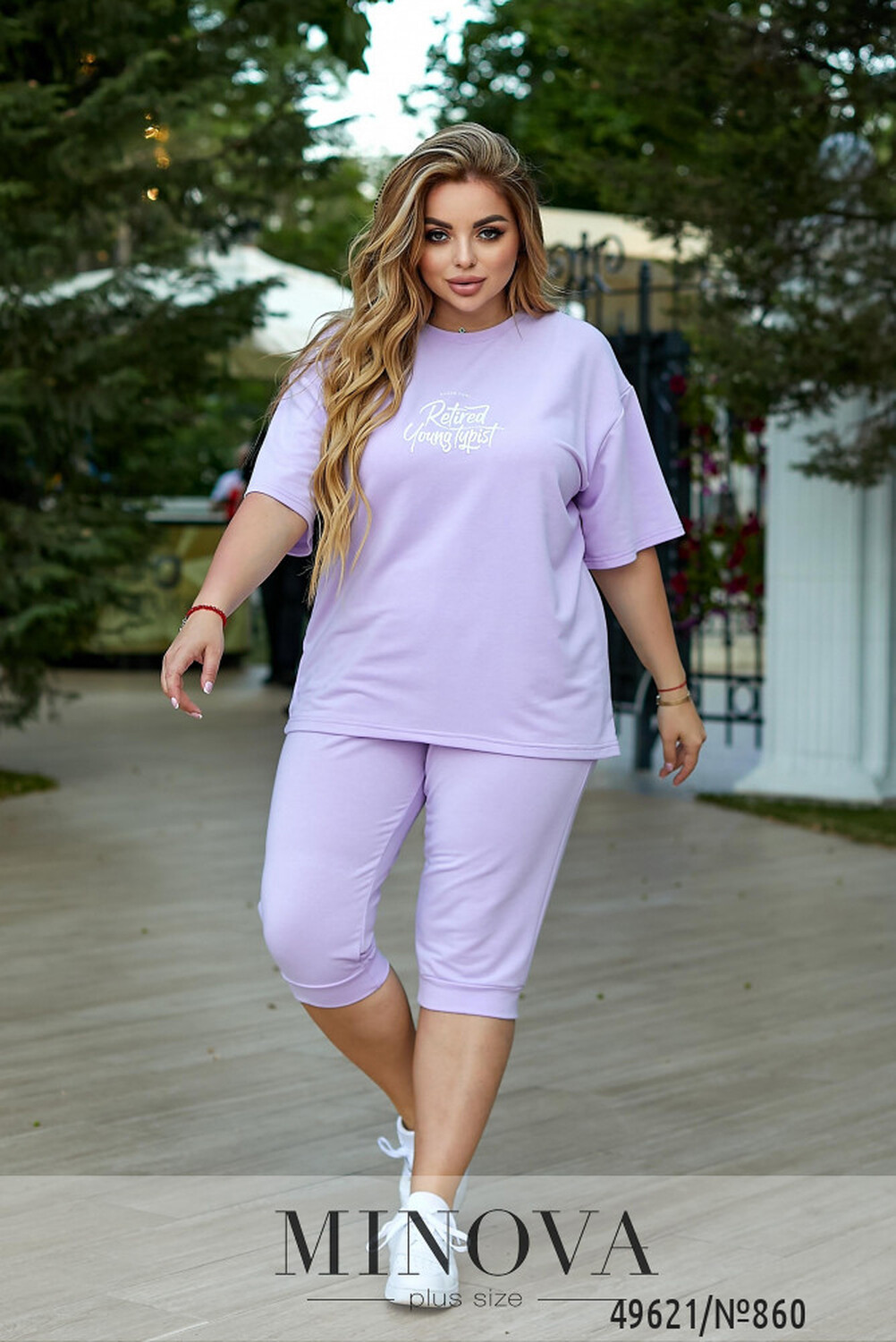 Комплект включає оверсайз футболку зі спущеною лінією плечей. Горловина футболки має напівкруглий крій з окантовкою. На передній частині футболки розташований декоративний напис, що додає особливості стилю.