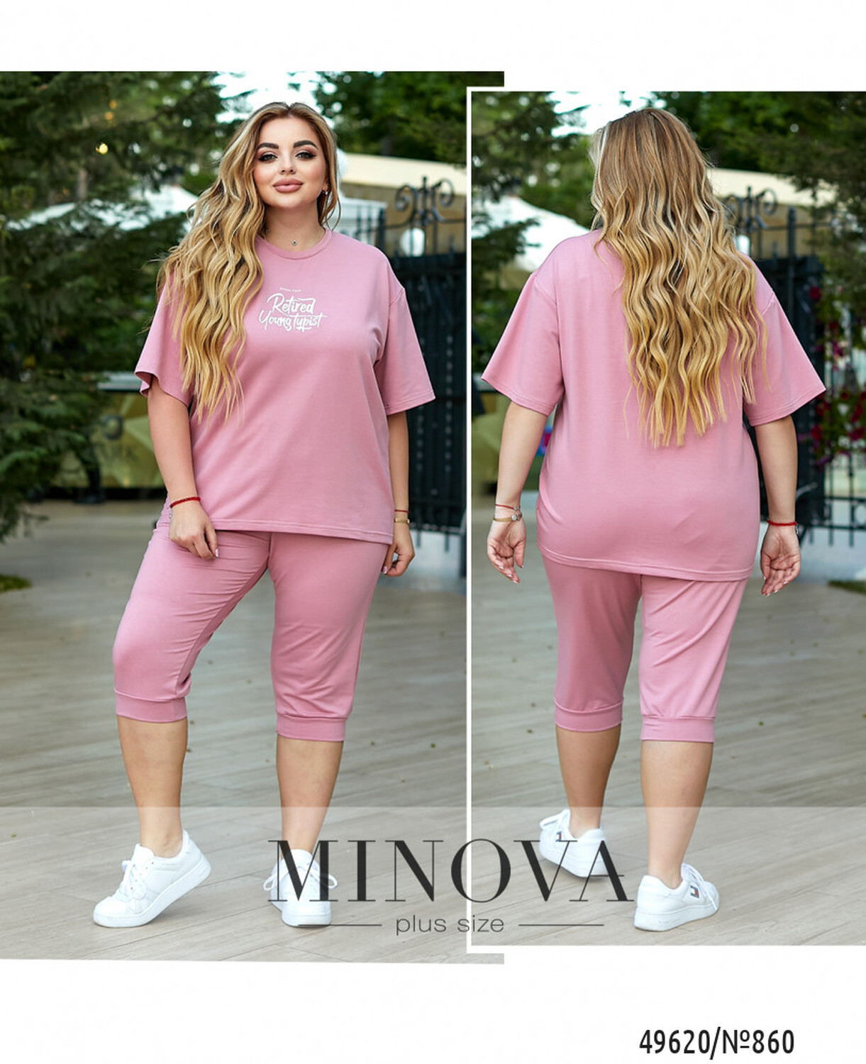 Комплект включає оверсайз футболку зі спущеною лінією плечей. Горловина футболки має напівкруглий крій з окантовкою. На передній частині футболки розташований декоративний напис, що додає особливості стилю.