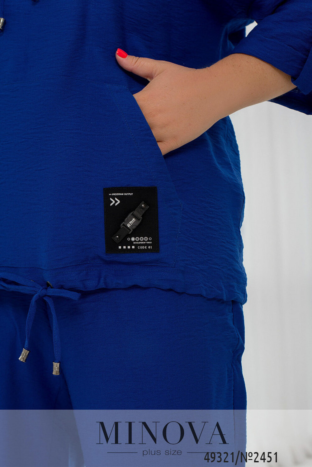 Костюм складається з кофти з капюшоном, через який проходить шнурок та який доповнено люверсами. Кофта має велику кенгуру-кишеню з термоналіпкою, де ви зможете зручно зберігати свої речі під руками. Рукава 3/7 з декоративною шльовкою додають костюму неповторний стиль та елегантність.