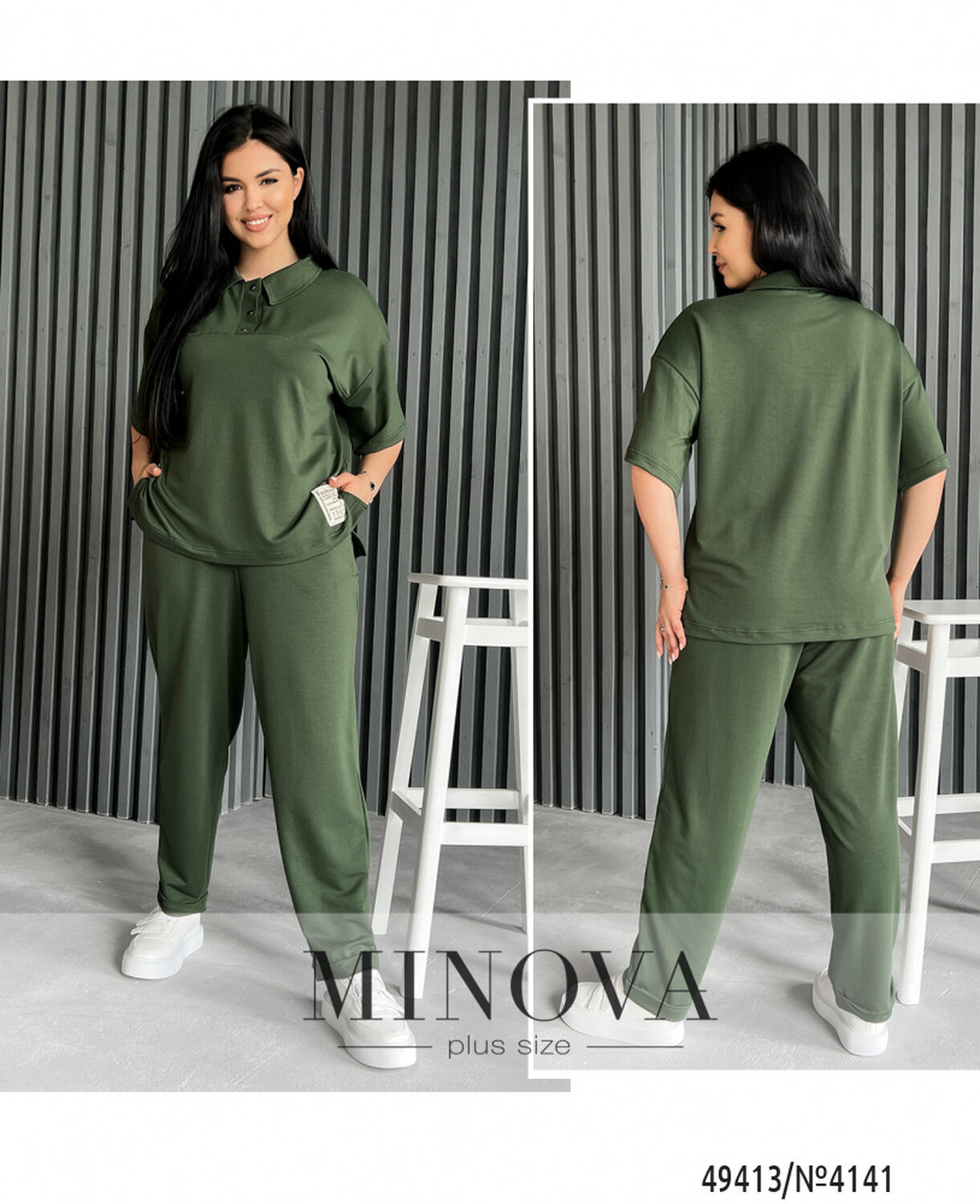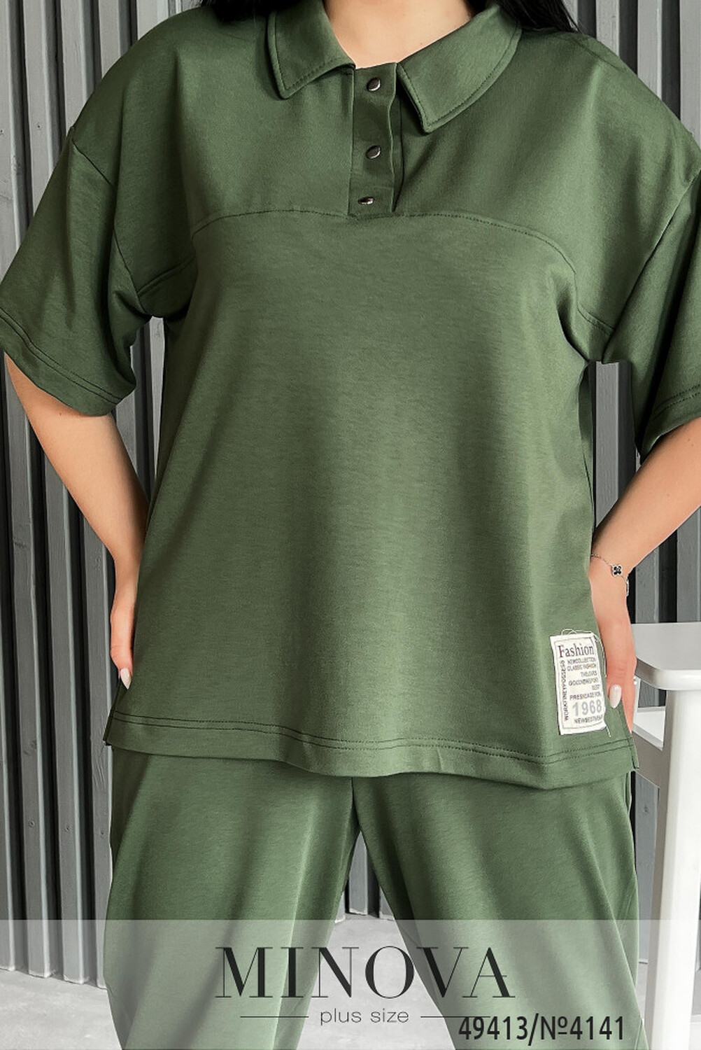 Цей комфортний прогулянковий костюм зроблений з двонитки та складається з брюк і футболки. Брюки мають дві кишені та прикрашені манжетами. Вони також мають пояс на резинці, що забезпечує зручну посадку. Футболка у вигляді поло, має нашивку та два розрізи по боках. Рукави футболки спущені, а горловина застібається на кнопки та має відкладний комірець.