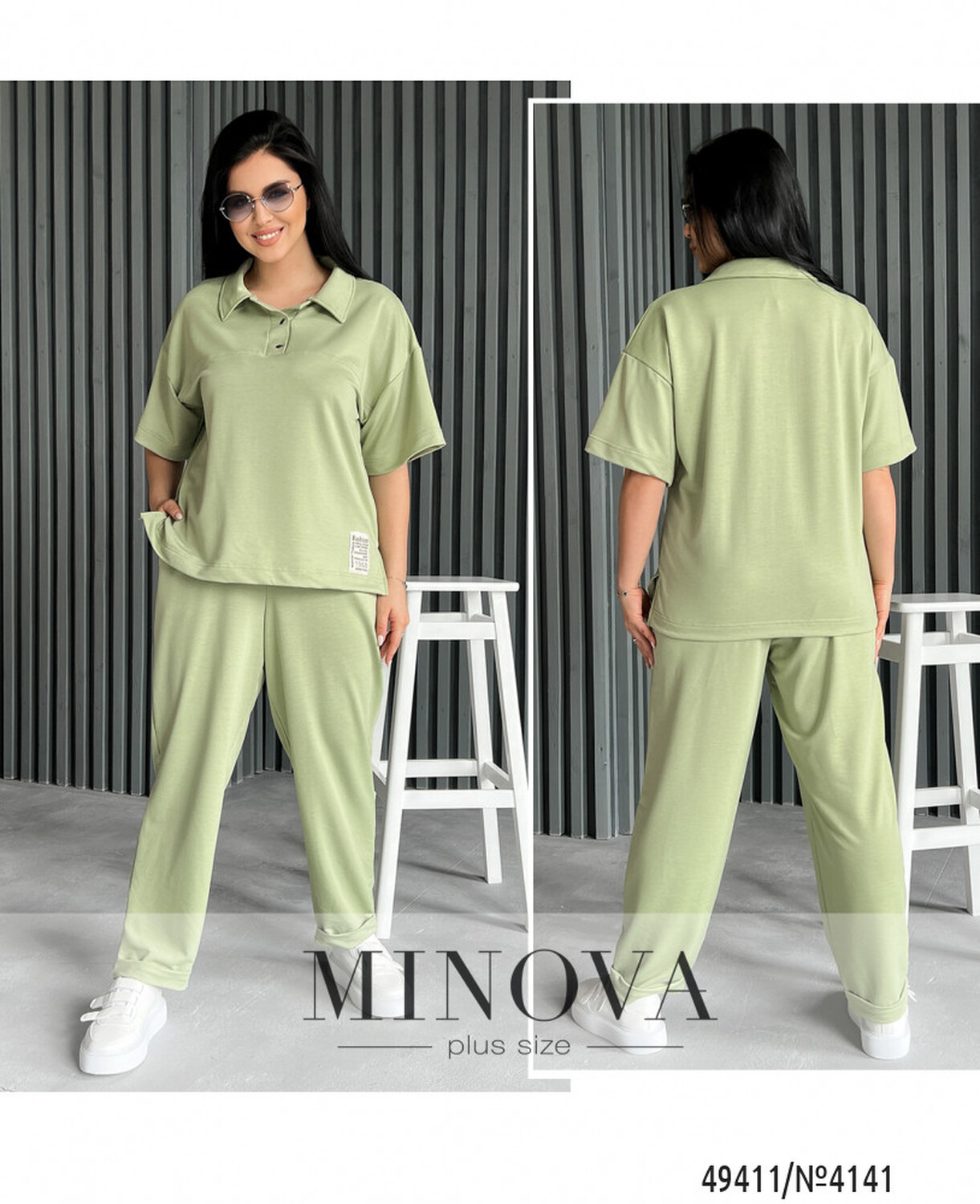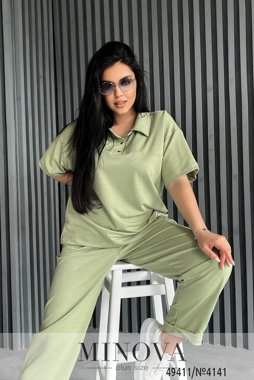 Цей комфортний прогулянковий костюм зроблений з двонитки та складається з брюк і футболки. Брюки мають дві кишені та прикрашені манжетами. Вони також мають пояс на резинці, що забезпечує зручну посадку. Футболка у вигляді поло, має нашивку та два розрізи по боках. Рукави футболки спущені, а горловина застібається на кнопки та має відкладний комірець.