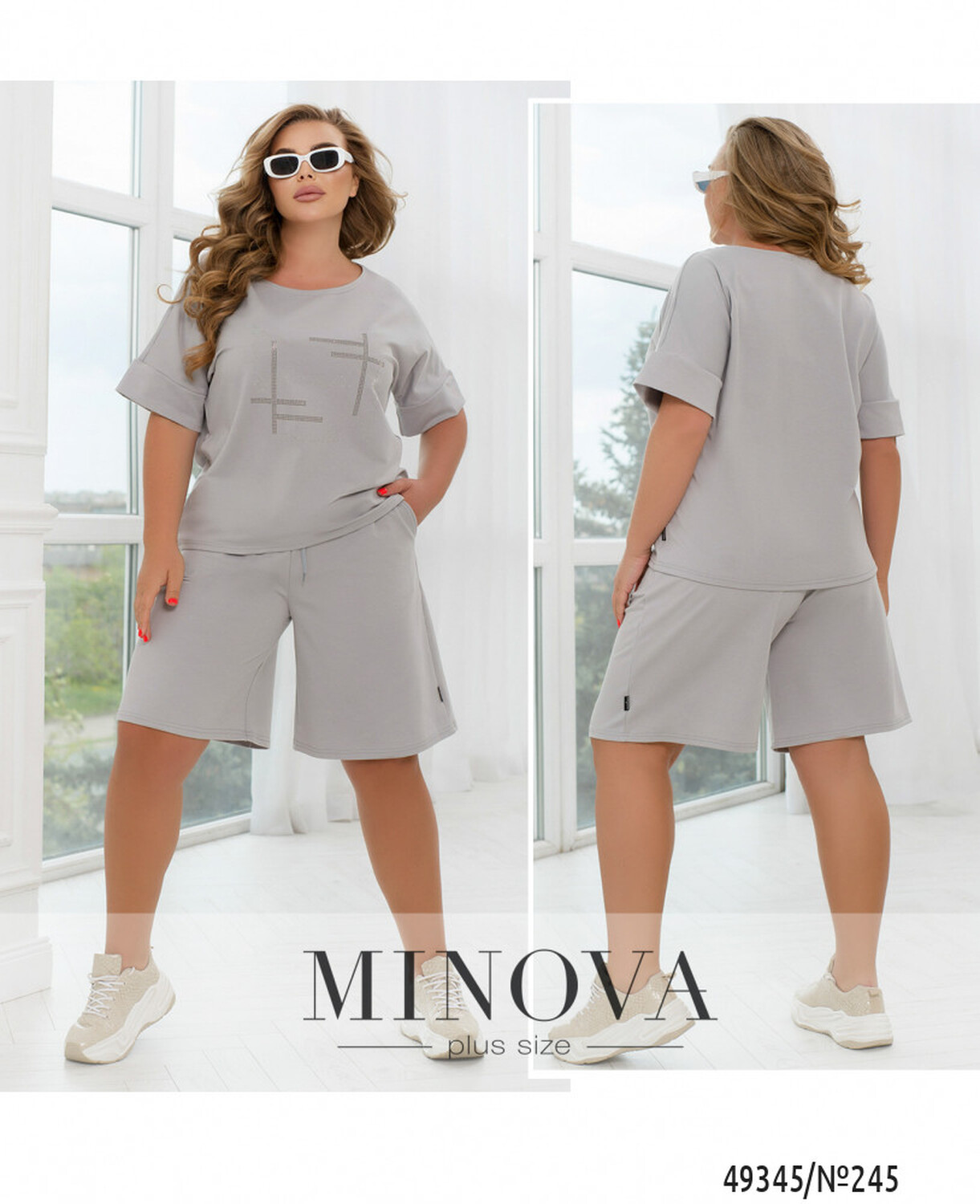 Виріб виконаний з досить приємної на дотик тканини, яка огортає комфортом. В комплект входить футболка оверсайз крою з напівкруглою горловиною. Основа футболки прикрашена малюнком зі стразиків, яка додає цікавості виробу. Рукава спущеного крою та доповнені високим манжетом.
