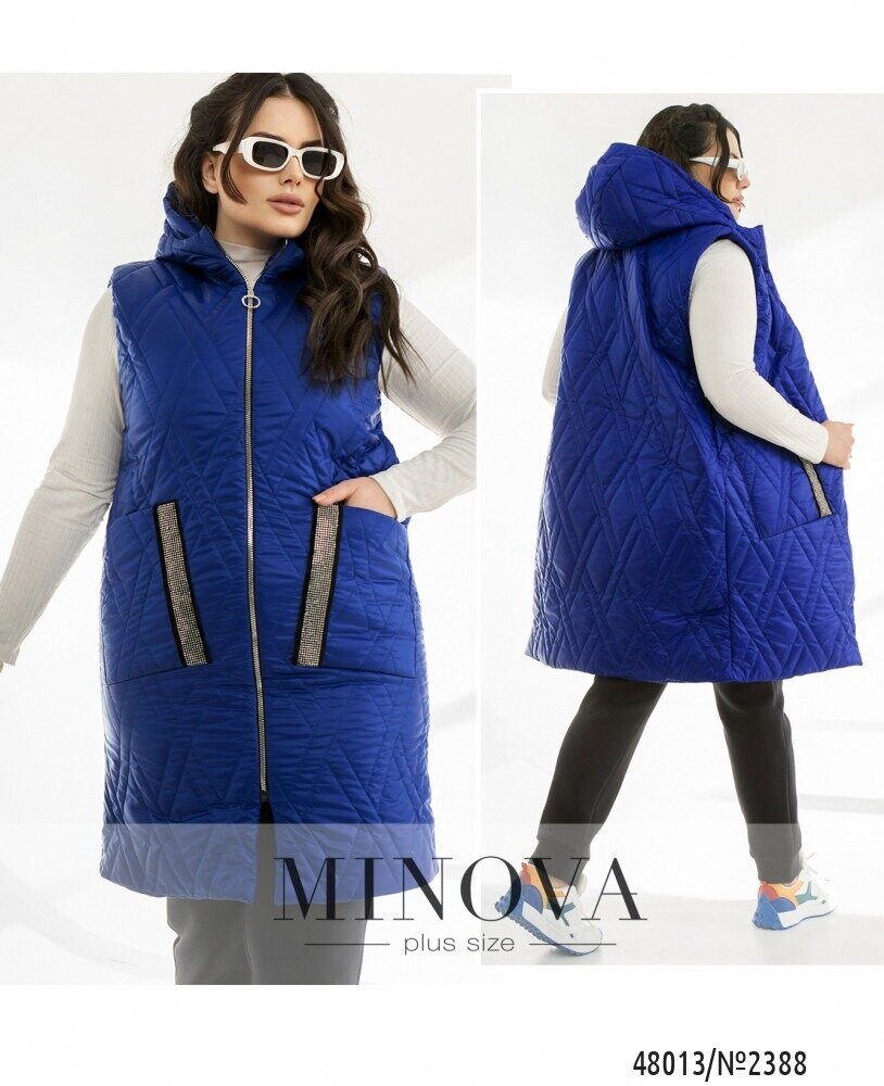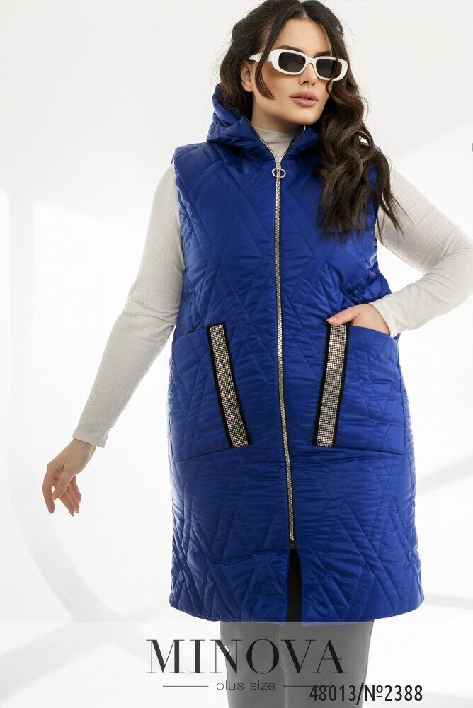 Зручний жилет для того, щоб створити дійсно яскраві образи. Ми вважаємо, що жилети - це неймовірно зручною одиницею в вашому гардеробі. Адже він може підходити під будь-який образ від суконь до спортивних костюмів. Модель подовжена по спинці. По передній частині розміщено дві накладні кишені, які декоровано стразами на замшевій основі. Модель має капюшон, який не відстібається. Цього сезону актуальними є теплі стьобані жилети вільного крою. Між жилетом та тілом має залишатися вільним простір.