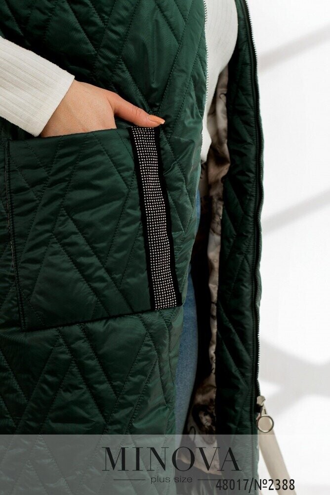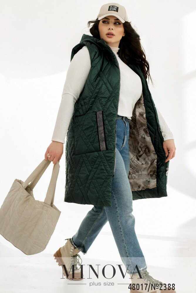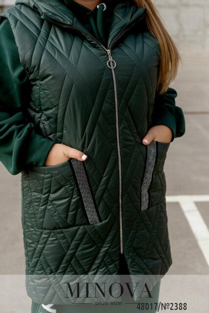Зручний жилет для того, щоб створити дійсно яскраві образи. Ми вважаємо, що жилети - це неймовірно зручною одиницею в вашому гардеробі. Адже він може підходити під будь-який образ від суконь до спортивних костюмів. Модель подовжена по спинці. По передній частині розміщено дві накладні кишені, які декоровано стразами на замшевій основі. Модель має капюшон, який не відстібається. Цього сезону актуальними є теплі стьобані жилети вільного крою. Між жилетом та тілом має залишатися вільним простір.