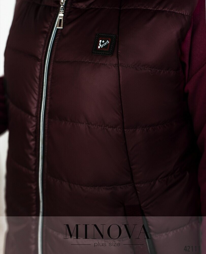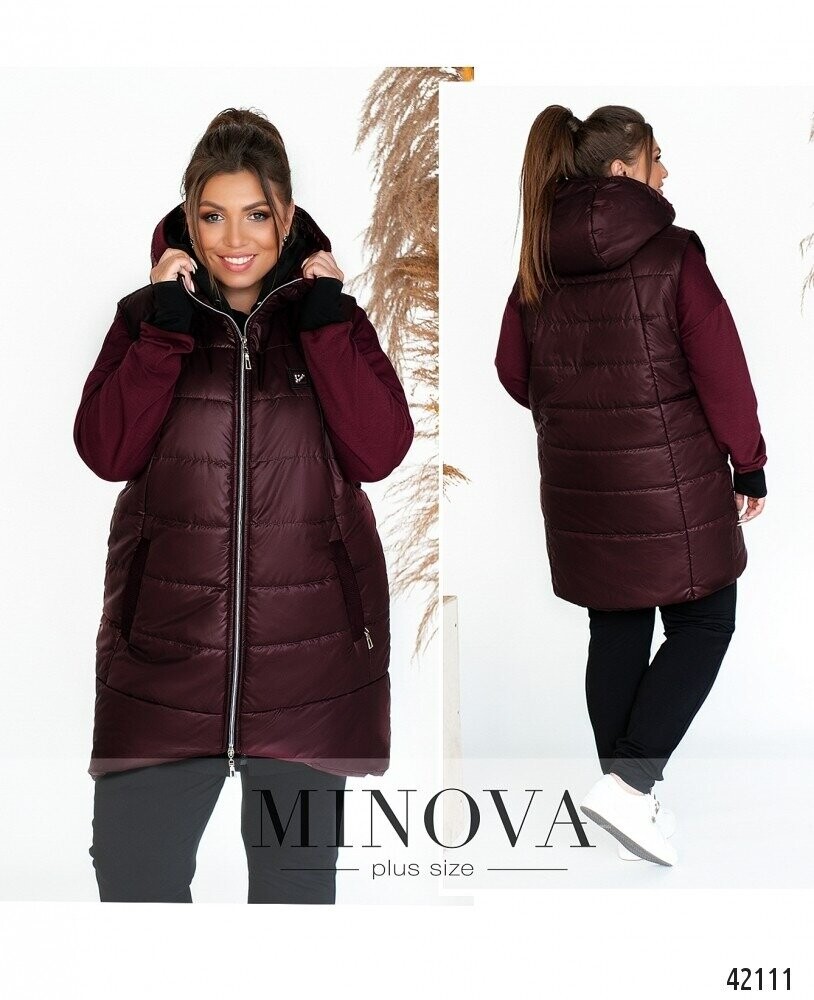Привабливий жилет батал із капюшоном, з підкладкою, прошитий. По сторонам - врізані кишені з блискавкою. Застібається на блискавку, розташовану по центру, від капишона до низу.
